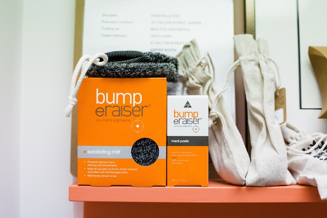 MF Pro-Tip: Meet Bump Eraiser. If you suffer from ingrown hairs, this magic mitt is a must. 90% of Miss Fox clients successfully keep ingrown hairs at bay by using this super quality exfoliating mitt. Regular use buffs away the naturally occurring build-up of dead skin cells that trap hairs, reducing the chance of ingrown hairs from forming. If you’re super prone to those pesky ingrowns, you may like to add Bump Eraiser Medi Paste to your routine.