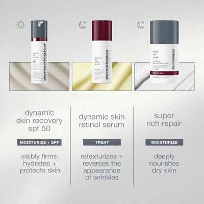 Bring home best-selling AM and PM formulas to renew and replenish skin around the clock — and give skin the comforting rest it deserves. Begin each day with Dynamic Skin Recovery SPF 50, a hydrating and firming SPF moisturizer. At night, use Dynamic Skin Retinol Serum to reduce the four signs of aging in two weeks.* Finish with nourishing and age-defending Super Rich Repair moisturizer, and enjoy a good night’s rest. *Clinical results with 30 volunteers on reduction in appearance of wrinkles, pores, dark spots, and uneven texture in a 2-week test.