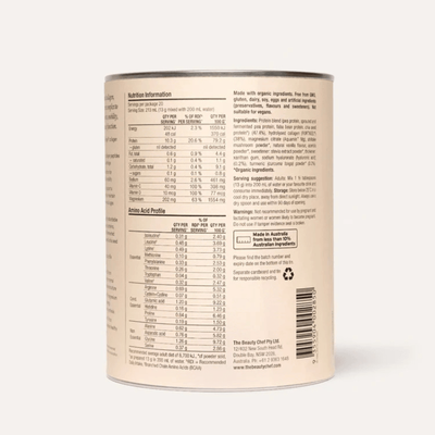Protein blend (pea protein, sprouted and fermented pea protein, faba bean protein, chia seed protein*) (47.4%), hydrolysed collagen (FORTIGEL®) (38%), magnesium citrate (Aquamin Mg®), shiitake mushroom powder*, natural vanilla flavour, acerola powder*, sweetener: stevia extract powder*, thickener: xanthan gum, sodium hyaluronate (hyaluronic acid) (0.2%), turmeric (curcuma longa) powder* (0.2%). *Organic ingredients.